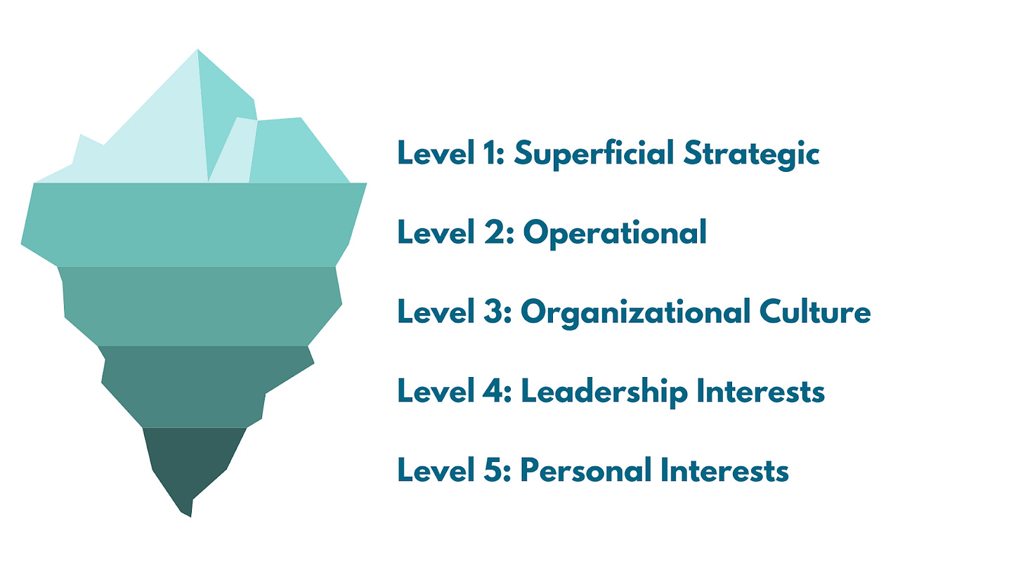 As an outsider to the organization, you likely know very little about the deeper levels. This is one of the reasons for you to walk along the "Spectrum of Relationships", forming close relationships and partnerships before implementing an M&A idea.